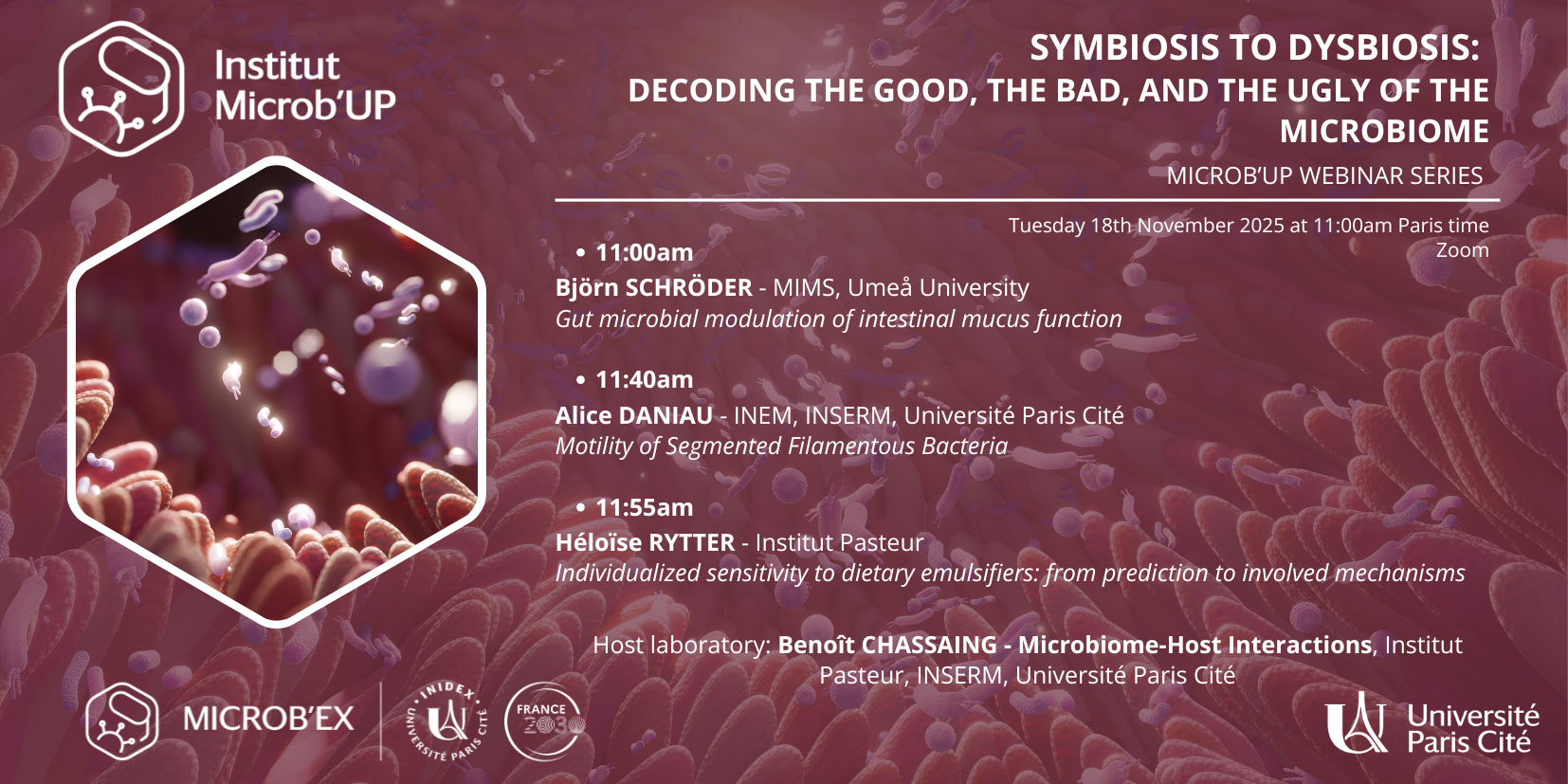 As part of the organization of the Microb’UP webinar series, the "Instituts Hors-Murs" (IHM) implement the processing of personal data. The legal basis for the processing is the performance of a task carried out in the public interest (Article 6 (1) e of the GDPR). The categories of personal data processed are those collected in response to questions (name, first name, professional email, unit, team). The organizers (IHM project manager and IHM supervisors) are, within the scope of their respective needs, the recipients of the data. The data is retained for one year from the collection of the form and then deleted. You can access your data, request its rectification or deletion. You can also object to the processing of your data or request the restriction of the processing of your data. To exercise these rights or for any questions regarding the processing of your data, you can contact the service responsible for the processing at suivi.ihm.sante@u-paris.fr or the Data Protection Officer (DPO) electronically at dpo@u-paris.fr. If you believe, after contacting us, that your rights under data protection laws are not being respected, you can submit a complaint online to the CNIL or by postal mail.